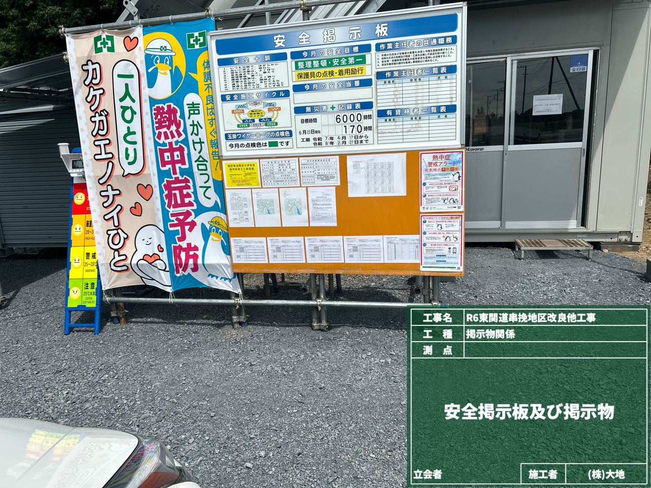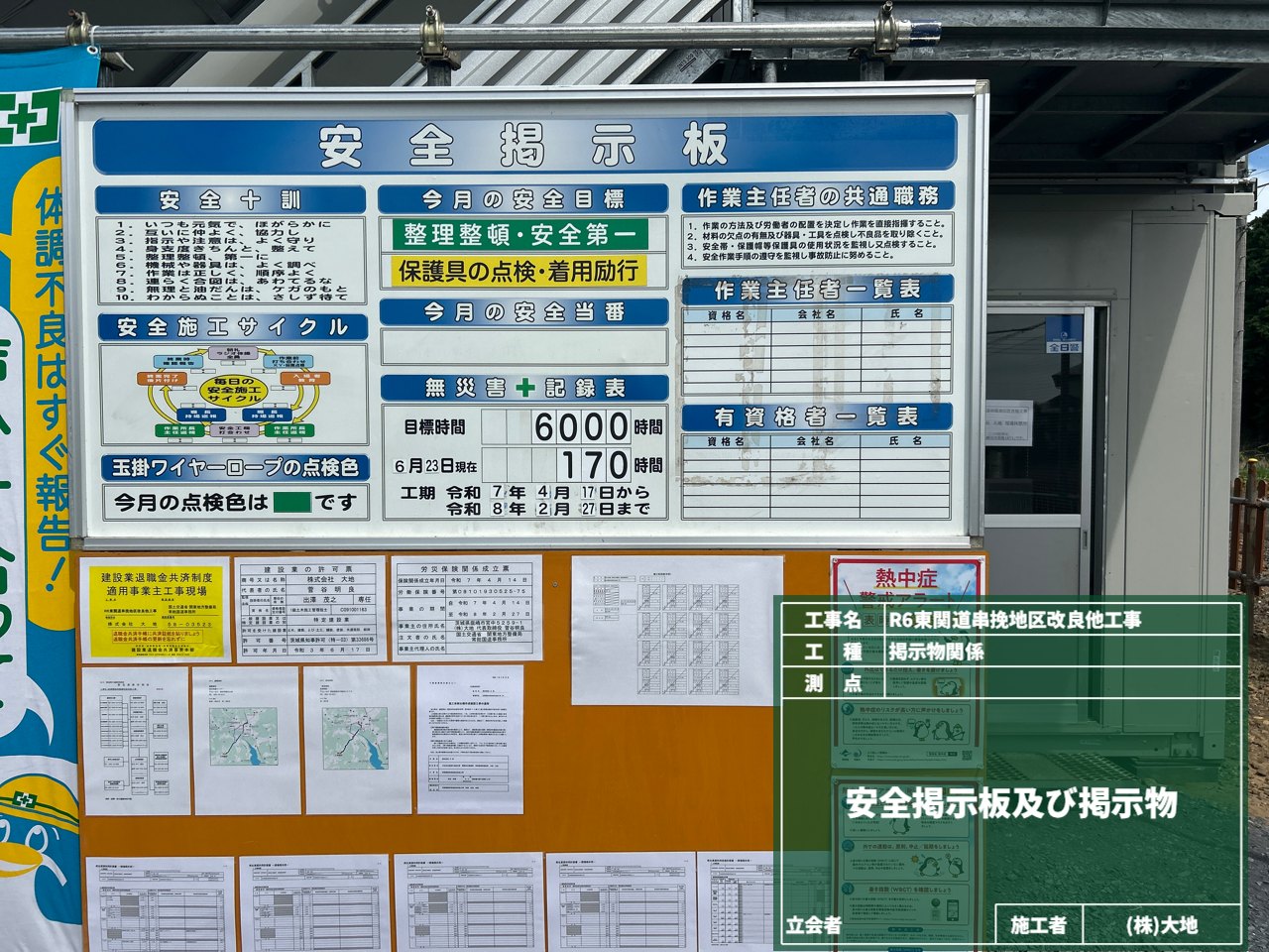 掲示板には安全目標や無災害記録・注意事項を掲示して、作業員が常に安全を意識して作業できるようにする「気づきの場」として活用しています!