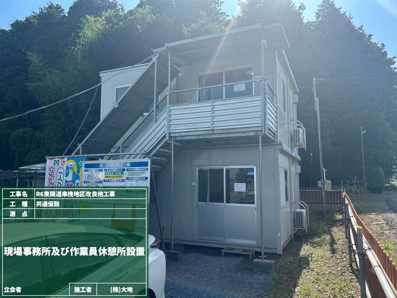ご覧の通り、現場事務所や安全掲示板などの設置も完了しました!