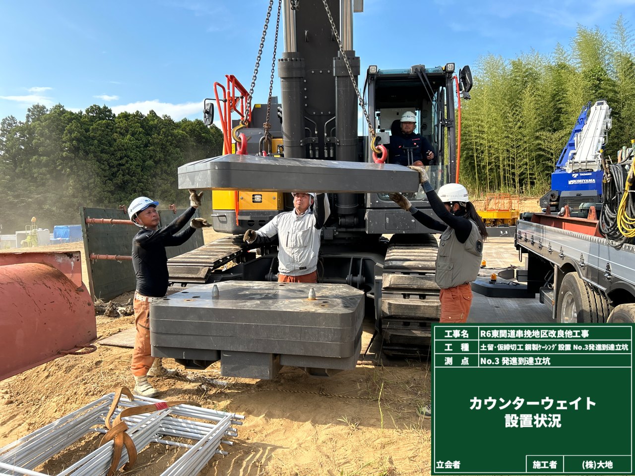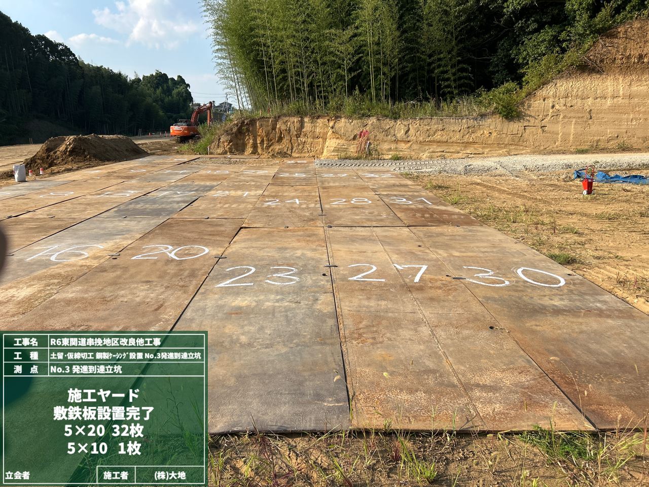 これから工事車両がたくさん通る工事用道路に、敷鉄板を敷きました。