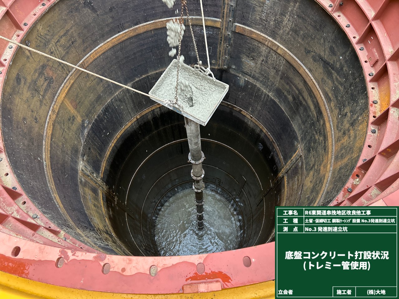 今回は水中コンクリートと言って流動性のあるコンクリートなので、トレミー管という漏斗のような役割をする道具を使って流し込みます。