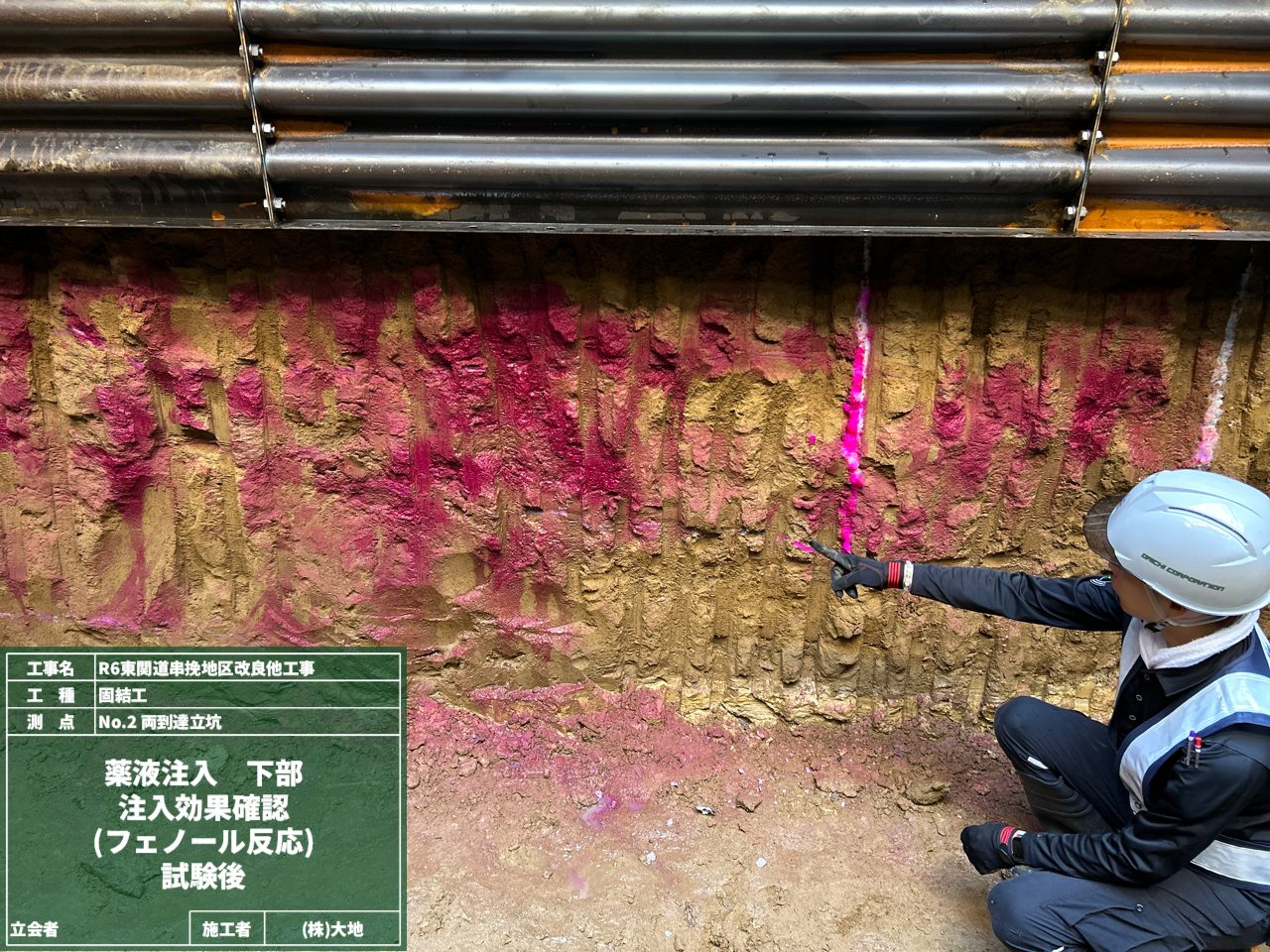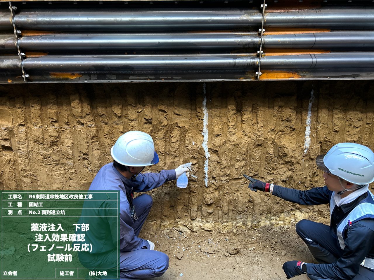 掘削時に地盤が崩れないように、あらかじめ薬液を注入しました。