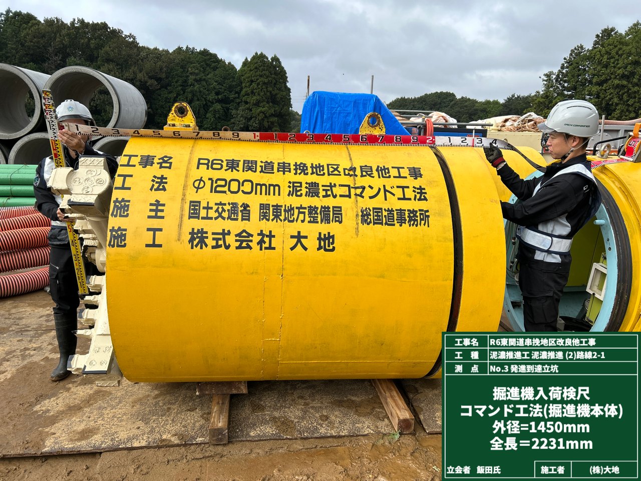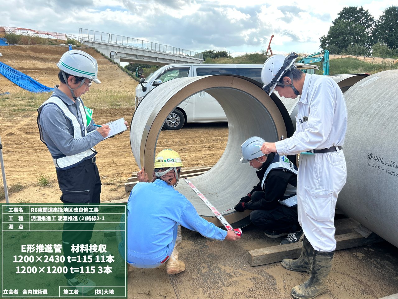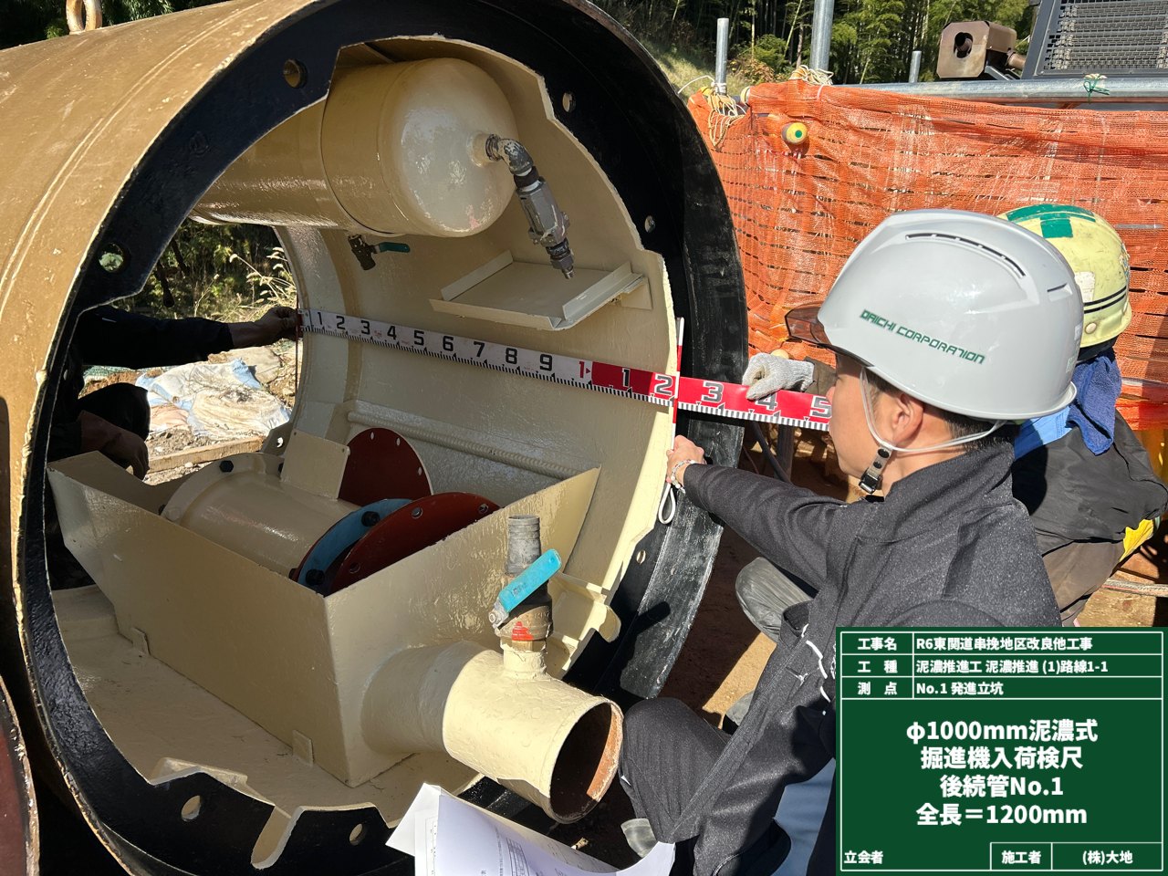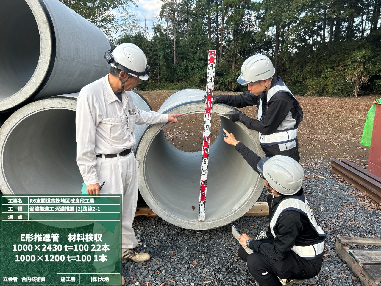 そして高い所—つまり地上では、推進管の材料検査を行いました。